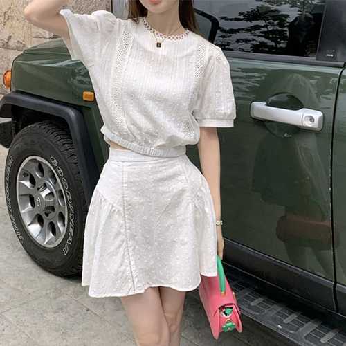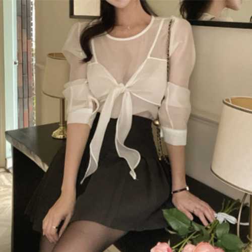 크롭기장 반팔티 시스루 티셔츠 여자 프릴 이너 여름
