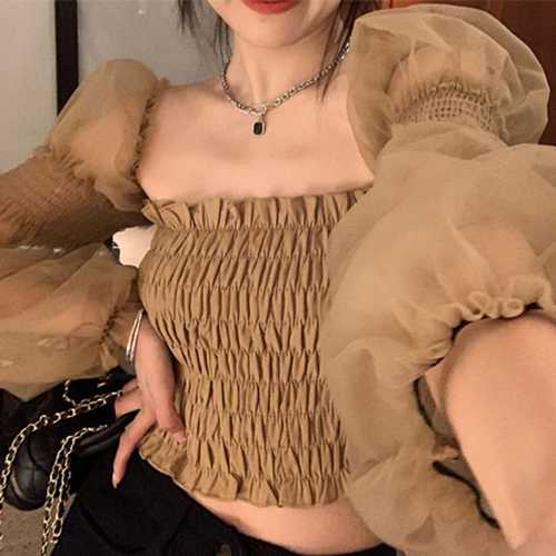 슈팅스타 / 스퀘어넥 퍼프소매 시스루 크롭 블라우스 321536
