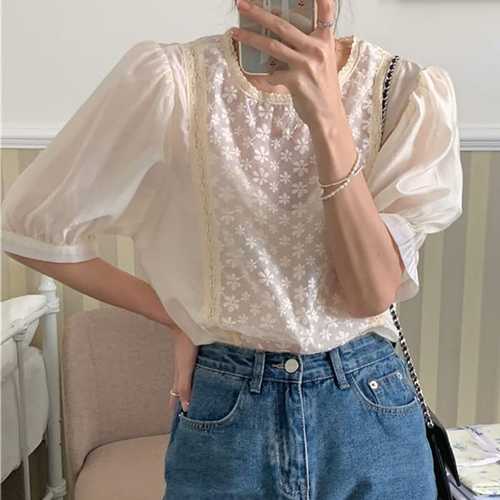 슈팅스타 / 브이넥 슬리브 플라워자수 시스루 레이스 셔츠 87355