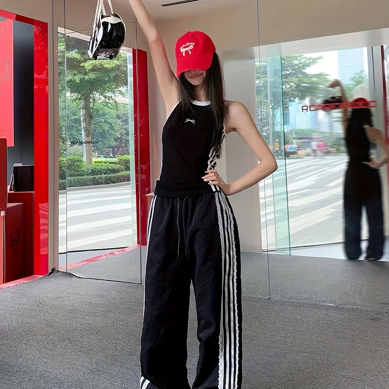 TEMU 여성용 레트로 레이스 와이드레그 캐주얼 팬츠 - 신축성 있는 끈 조절 허리, 고품질 폴리에스터, 흰색 줄무늬 블랙, 봄·여름·가을에 적합한 매끄러운 질감의 바지
