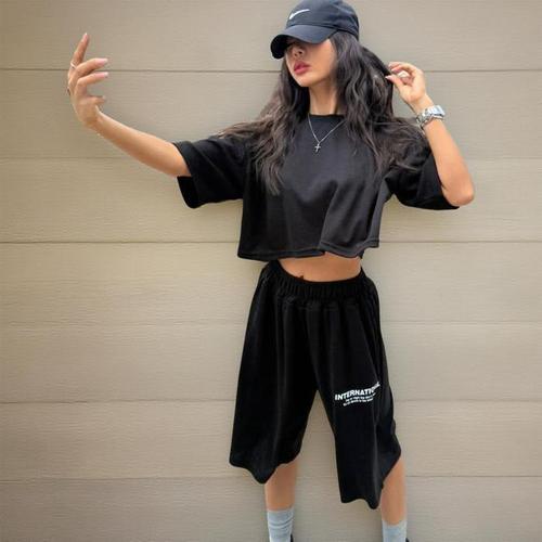 [신상오픈런]여성 크롭 반팔 티셔츠 레터링 와이드 트레이닝 반바지 세트 (35835412)