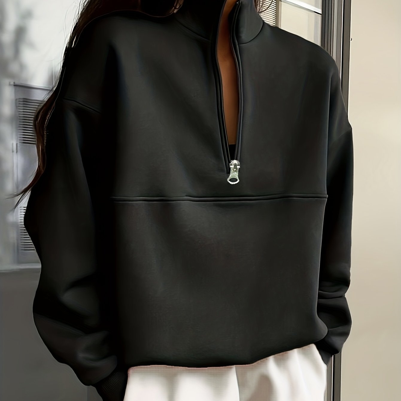 TEMU 여성용 캐주얼 스포티 하프지퍼 후드 - 솔리드 블랙 스탠드 칼라 긴팔 풀오버, 가을 겨울 스웨트셔츠, 세탁기 사용 가능