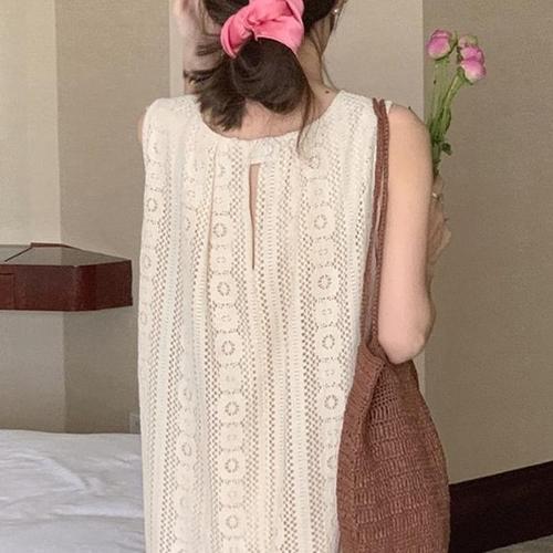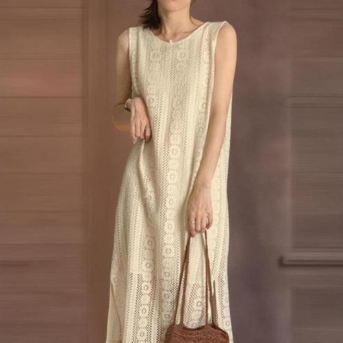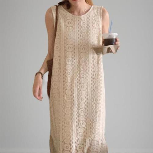 [신상오픈런]아이보리 색상 여성 나시 롱 원피스, 자수 디테일 및 뒷단추 트임 디자인 (41032805)