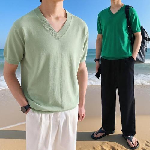 [지지블랙][1+1] 시원하고 편한 루츠 린넨 브이넥 반팔 니트 티셔츠 아이스 쿨 스판 V넥 ZZBKNS013