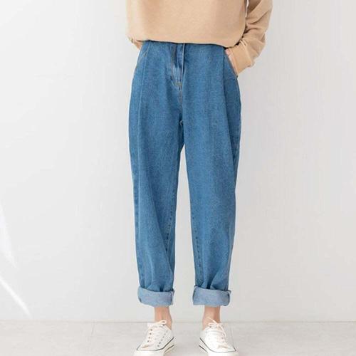 여자핀턱배기청바지 진청 1P 오버핏 스판 데님청바지