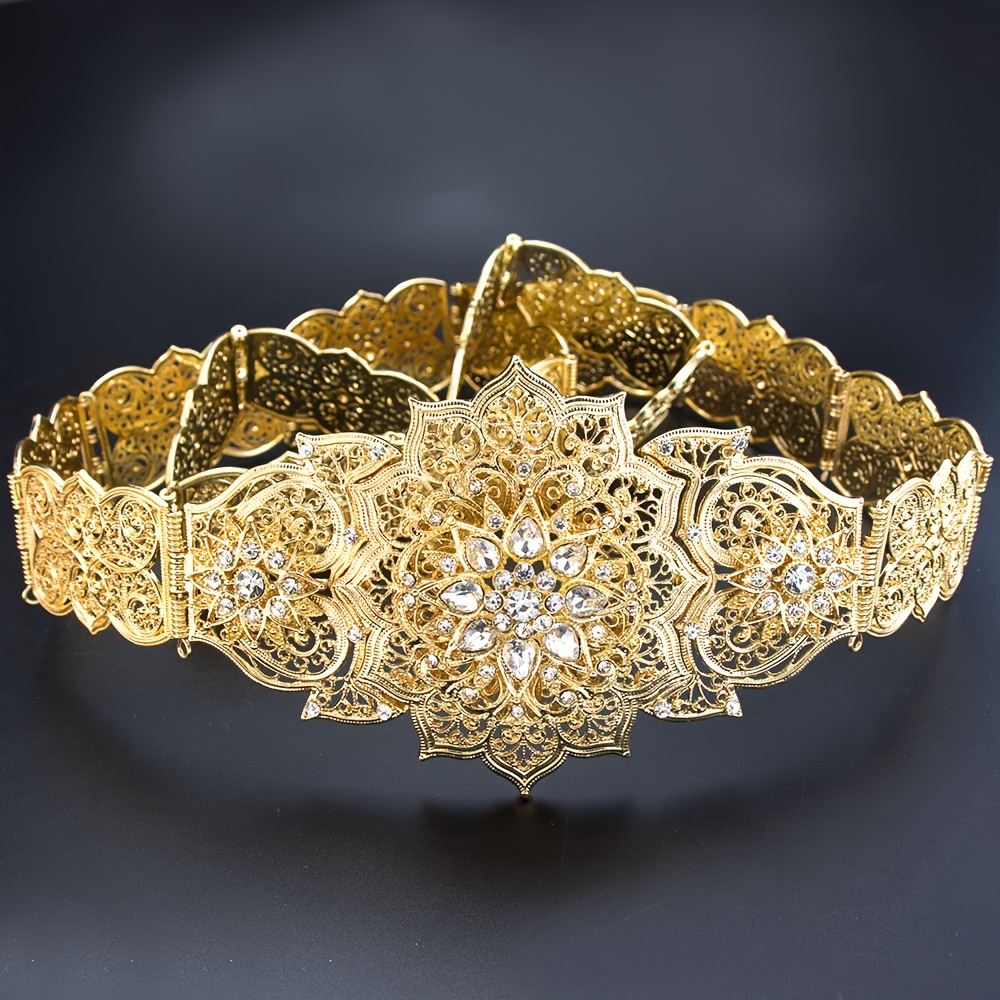 TEMU 1개 모로코 카프탄 스타일 여성용 화려한 패션 장식 벨트, 금속 소재에 홀아웃 패턴과 유리 라인스톤 인레이