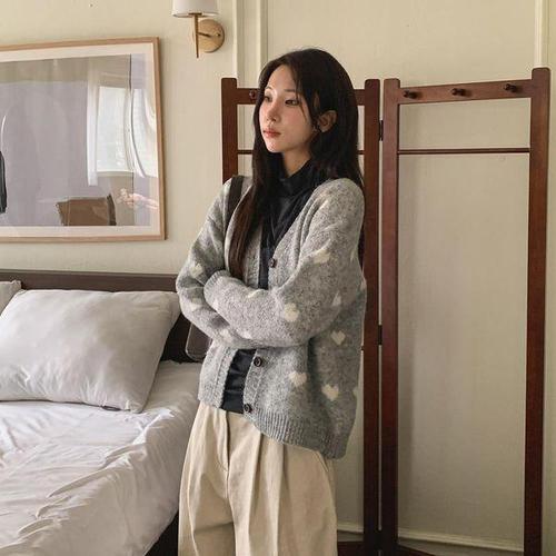 [미라클세븐]여성 하트패턴 앙고라 루즈핏 브이넥 니트 가디건