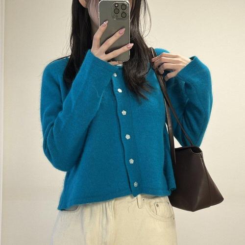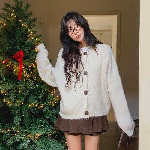 [옷자락]여성 봄 가을 빅버튼 라운드넥 앙고라 니트 가디건