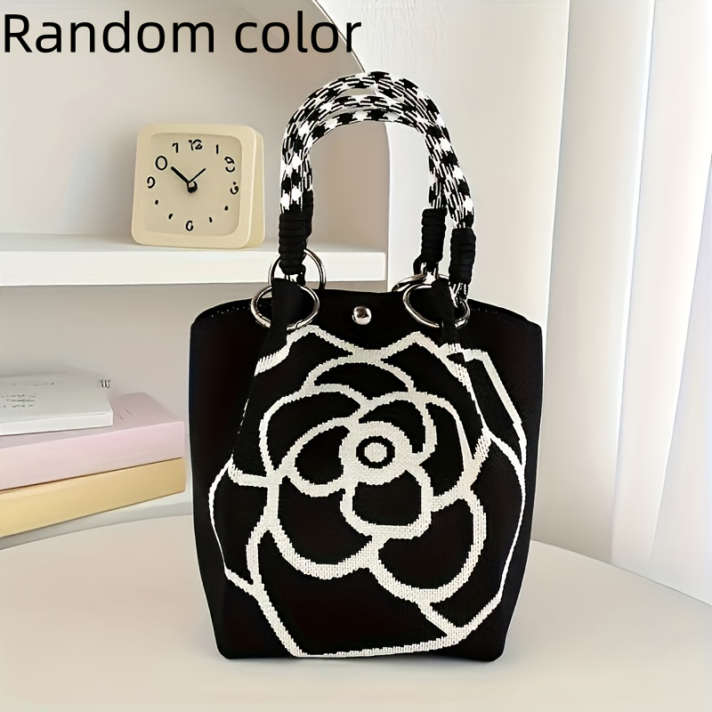 TEMU 여성용 우아한 블랙 & 화이트 플로랄 토트 핸드백 - 자석 잠금 & 튼튼한 스트랩 - 넉넉한 수납공간으로 일상, 여행, 정장에 적합 - 내구성 있는 폴리에스터, 우아한 여성 선물, 캐주얼 & 포멀 스타일