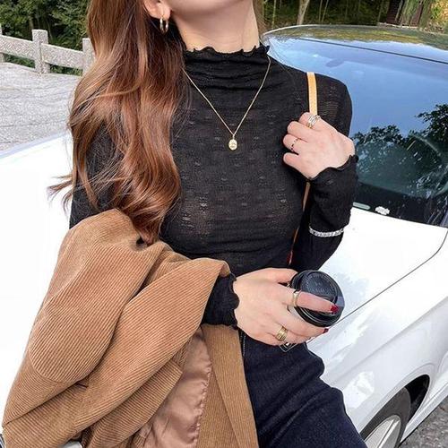 1+1봄가을 레이스 이너티 펀칭 고급스러운 망사 얇은 시스루 슬림핏 솔리드 터틀넥 상의