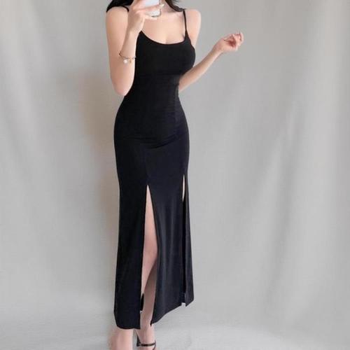 [신상오픈런]여성 슬림핏 패드 내장 트임 롱 원피스 어깨끈 (40724283)