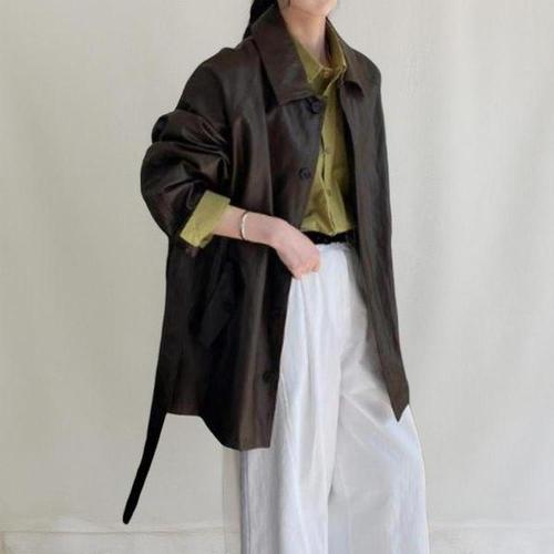 [신상오픈런]여성 키치 무드 벨트 하프 코트 배색 안감 가죽 코트