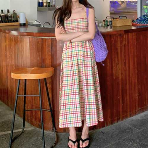 슈팅스타 / 컬러 체크 비치룩 해변룩 끈나시 뷔스티에 원피스