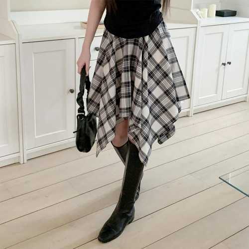 옷자락 / 여성 간절기 언발란스 체크 밴딩 플레어 스커트