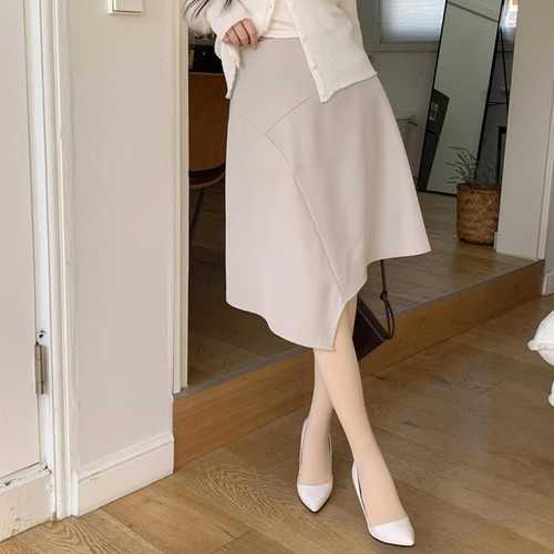 옷자락 / 여자 사선 절개 언발 포인트 미디 무지 스커트