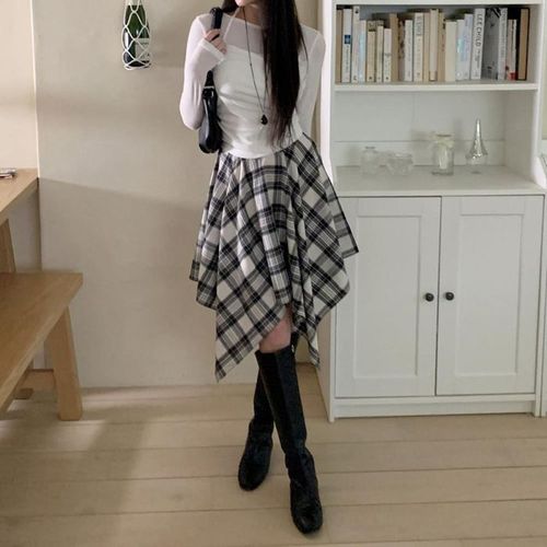 옷자락 / 여자 간절기 언발 체크 밴딩 플레어 스커트