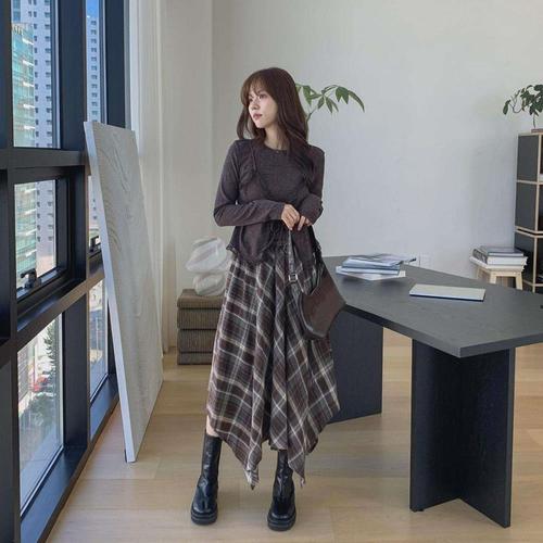 [옷자락]여성 체크 언발 플레어 밴딩 벨티드 롱 스커트