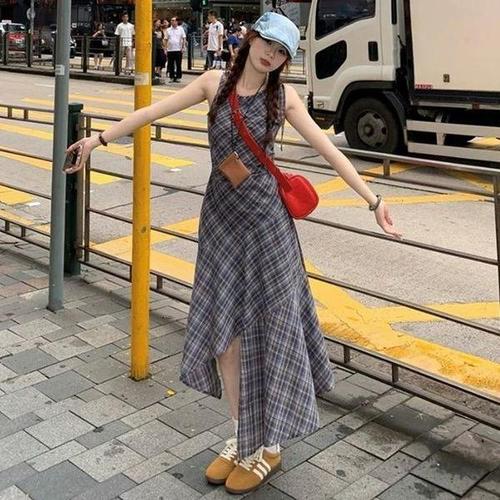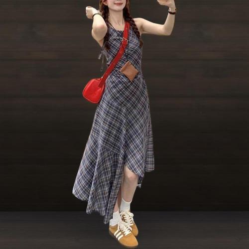 [신상오픈런]여성 체크 패턴 언발란스 플레어 민소매 롱 드레스