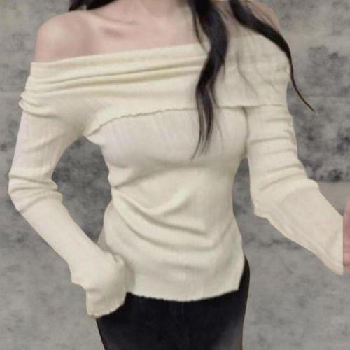 [다잇템]여자 비침 언발크롭 롱슬리브 언발숄더 티셔츠