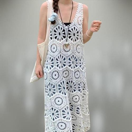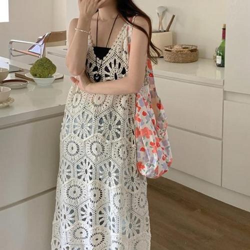 브이넥 민소매 나시 에스닉 보헤미안 손뜨개 니트 레이스 레이어드 원피스 휴양지 비치 바캉스 YAPOGI