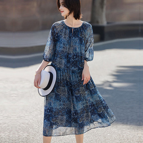 [MAXZA] 에스닉 패턴 보트넥 쉬폰 롱 원피스