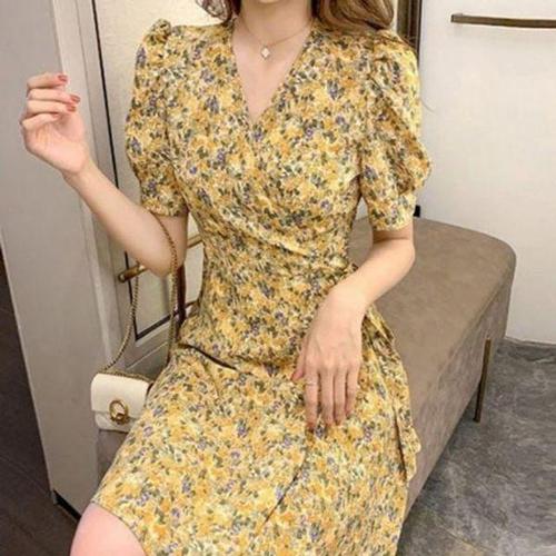 [에이치플러스몰]꽃무늬 랩 데일리 브이넥 원피스 클래식 반팔 에스닉
