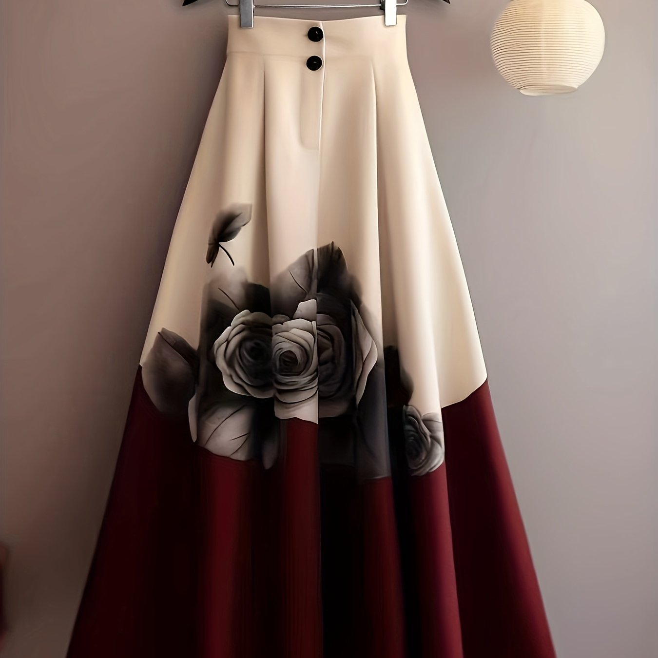 TEMU 빈티지 레드 대비 프린트 스커트, 가을/겨울 고급스러운 스타일 A라인 맥시 스커트, 감각