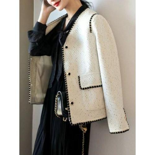 TEMU 여성용 프렌치 스타일 트위드 재킷 - 시크한 짧은 길이, 버튼업 프론트, 루즈핏, 사계절용 아우터웨어, 대조 트림, 캐주얼부터 포멀웨어까지, 캐주얼 웨어 재킷 | 시크한 짧은 재킷 | 버튼업 재킷, 여성용 울 코트, 트윌 반팔|반팔