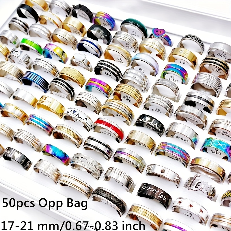 TEMU 대량 50개/봉지 여성용 패셔너블 스택드 링, 빈티지 우아한 스타일 스테인리스 스틸 제작, 골드와 실버 색상 제공. 남녀 공용 링은 다양한 기하학적 디자인으로 랜덤으로 배송됩니다. 파티 선물에 적합한 매력적인 링 세트(박스 없음), 여성용 주얼리, 링 세트, 반지, 특이한 반지, 반지 세트, 여성반지, 여성반지 세트, 빈티지 반지, 패션반지