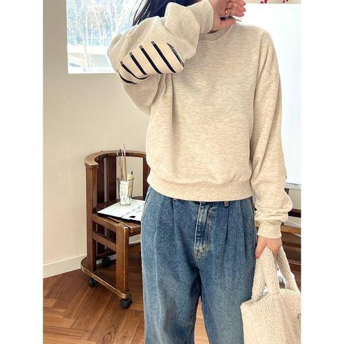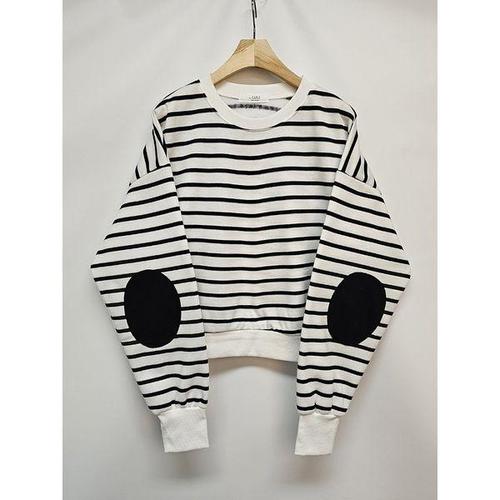 [샵앤]국산 여성 엘보패치 세미크롭 맨투맨 LL-WSH-4843-(줄)아이보리