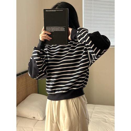 [샵앤]국산 여성 엘보패치 세미크롭 맨투맨 LL-WSH-4843-(줄)네이비