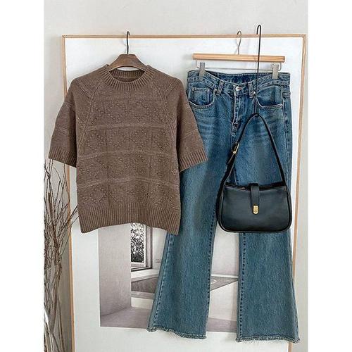 [샵앤]여성 라운드넥 다이아엠보 나그랑 반팔 니트티 BONG-WKN-4817-브라운