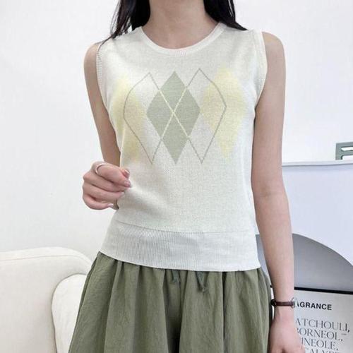 [에이치플러스몰]여성 여름 아가일 니트 조끼 1P 라운드넥 베스트 쪼끼
