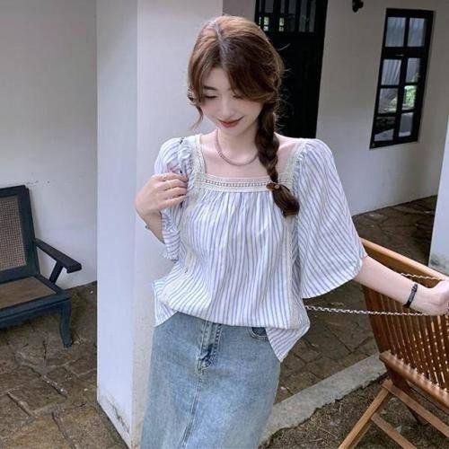 [에이치플러스몰]레이스 퍼프소매 여름 반팔 물결 여성 블라우스