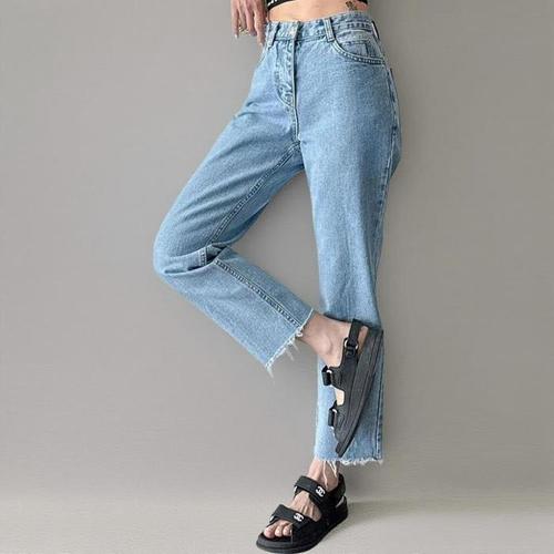 [신상오픈런]여성 세미 배기 진 연청색 뒷절개 여름 논스판 청바지 (37001460)