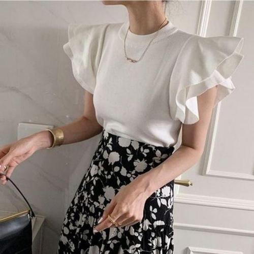 [에이치플러스몰]여름 인기 LF17400 이중 프릴 감성 소매 슬림 니트 반