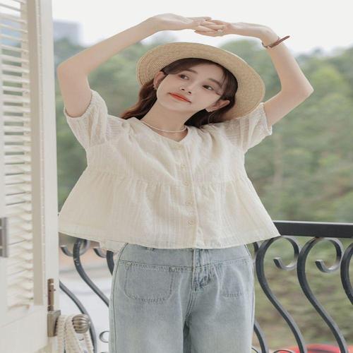 여성 탑 드레시 캐주얼 크루넥 블라우스 자카드 자수 퍼프 반팔 셔츠 여름 의상 트렌디한 2025