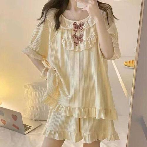 [셀러허브_여성트랜드패션]ONM 리본 프릴 파자마 세트 여성 반팔 잠옷 여름 홈