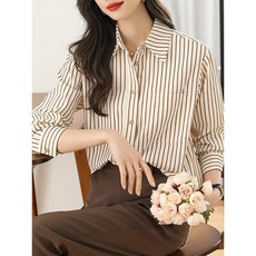 POMTOR여성 커피색 스트라이프 셔츠 봄 여름 긴팔 루즈핏 블라우스