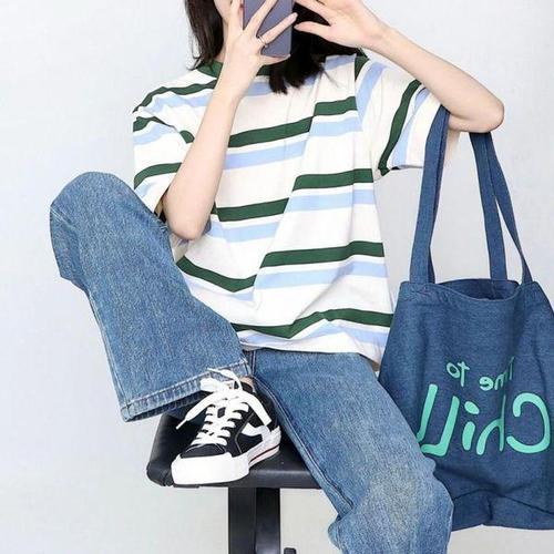 [에이치플러스몰]여름 여성 숏슬리브 반팔 순면 스트라이프 박스티 슬