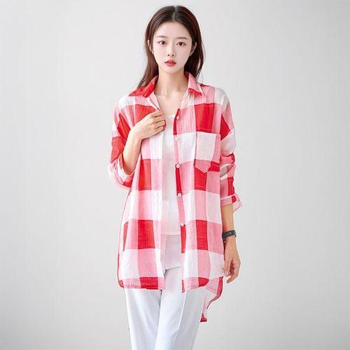[헬리꽁땡](55~88)2종세트 카라넥 오버핏 썸머 체크 커버업셔츠 롱셔츠 여성봄블라우스 롱티 박스티 여성..