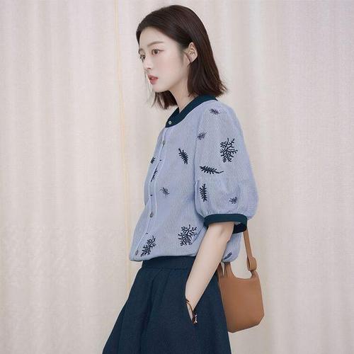 [헬리꽁땡](55~88)자수배색썸머블라우스 롱셔츠 여성봄블라우스 롱티 박스티 여성긴팔셔츠