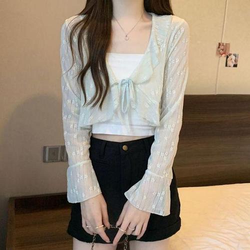 해외 신혼 여행 여자 얇은 시스루 숏 가디건 여름