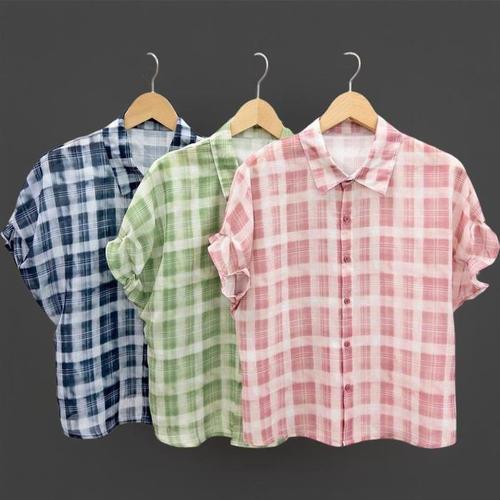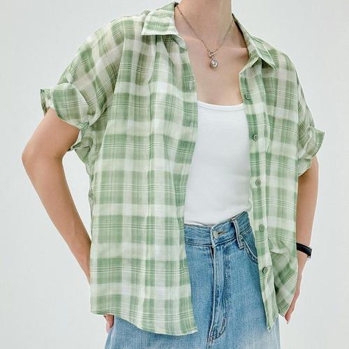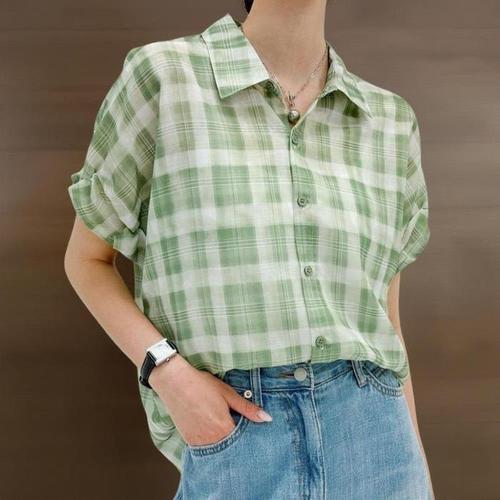 [신상오픈런]여성 체크 시스루 반팔 블라우스 린넨 여름 셔츠 (39139725)