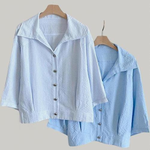 [신상오픈런]여성 여름 스트라이프 오픈 카라 7부 소매 블라우스 (35834871)