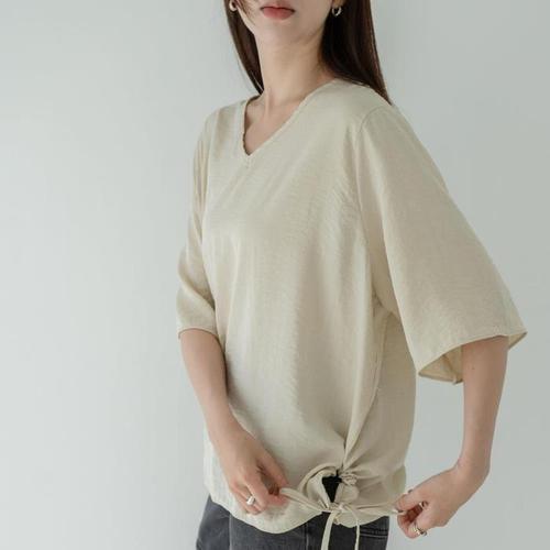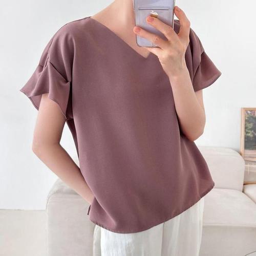 [신상오픈런]여자 여름 빅사이즈 스트랩 언발 브이넥 반팔 블라우스 (39383310)