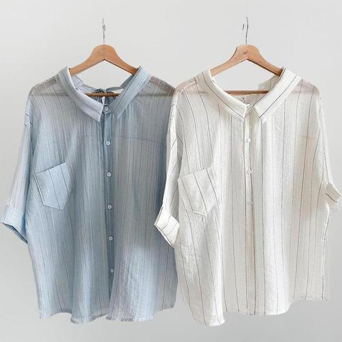 [신상오픈런]여성 여름 스트라이프 롤업 반팔 셔츠 포켓 시스루 블라우스 (39187386)
