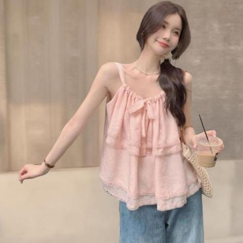 [신상오픈런]여성 여름 레이스 프릴 어깨끈 셔링 블라우스 (38284019)