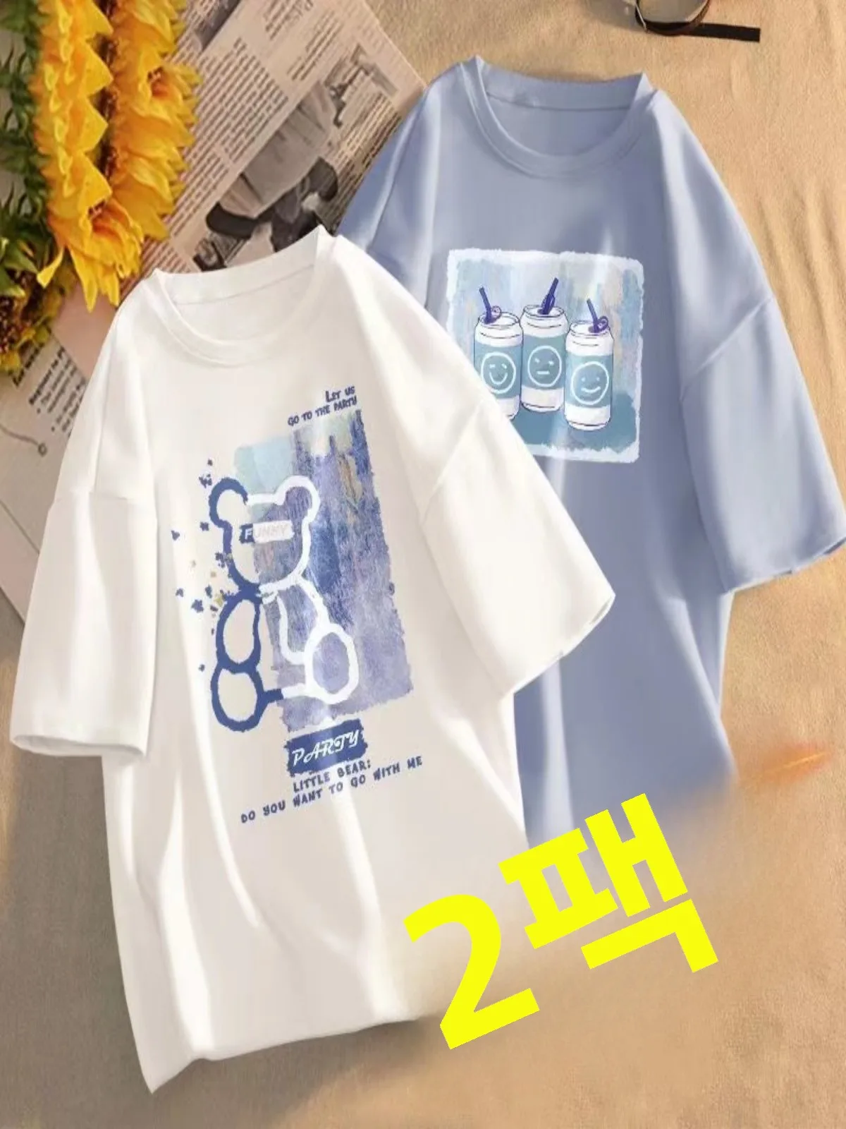 여름 루즈핏 여성 티셔츠 2팩 인기 프린트 반팔 한국 스타일 라운드넥 캐주얼 탑 (8-24세)