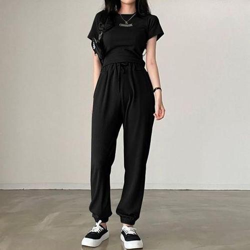 [에이치플러스몰]시원한 얇은 반팔 골덴 셋업 조거팬츠 여성 세트 여름